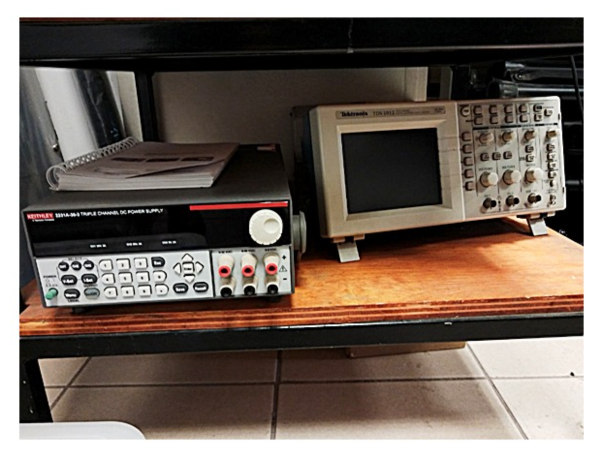 Fuente de alimentación Keithley de triple canal. Osciloscopio Tektronix TDS 1012. Utilizado para la medición y alimentación de prototipos de trabajo.